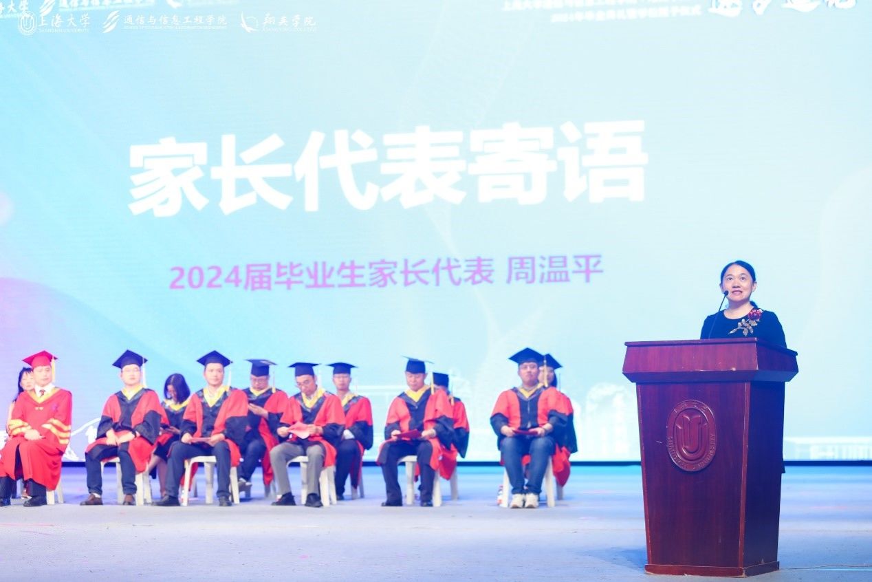 在這一值得銘記的時刻,2024屆本科畢業(yè)生周俊儒的母親周溫平女士,以一位家長代表身份,登臺發(fā)表講話。她用溫暖而誠摯的語言,向學校致以最高的敬意,向老師們表達了深切的感激之情,同時也向那些在學習生活中彼此扶持、共同進步的同學表達了由衷的謝意。最后鼓勵所有的畢業(yè)生們努力成為有擔當、肯奉獻、積極向上的時代新青年。