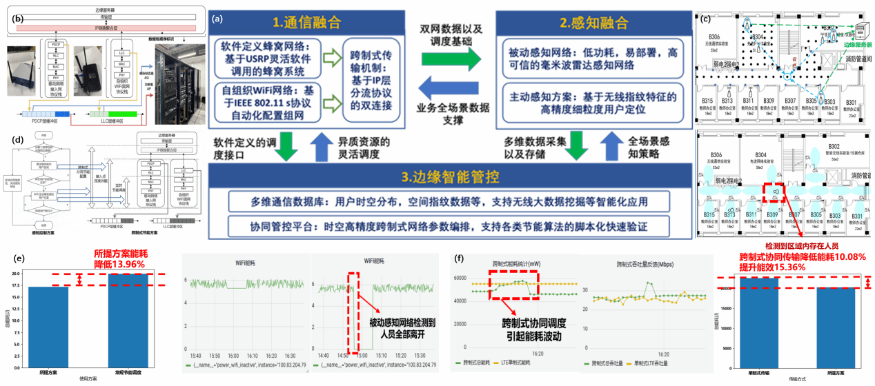 (a)高能效跨制式通感系統(tǒng)核心技術(shù)總覽,(b)通信融合跨制式IP分流傳輸機(jī)制,(c)感知融合主被動(dòng)定位方案,(d)邊緣協(xié)同管控平臺(tái)高精度網(wǎng)絡(luò)編排,(e-f)深度休眠以及跨制式調(diào)度策略降低能耗效果。