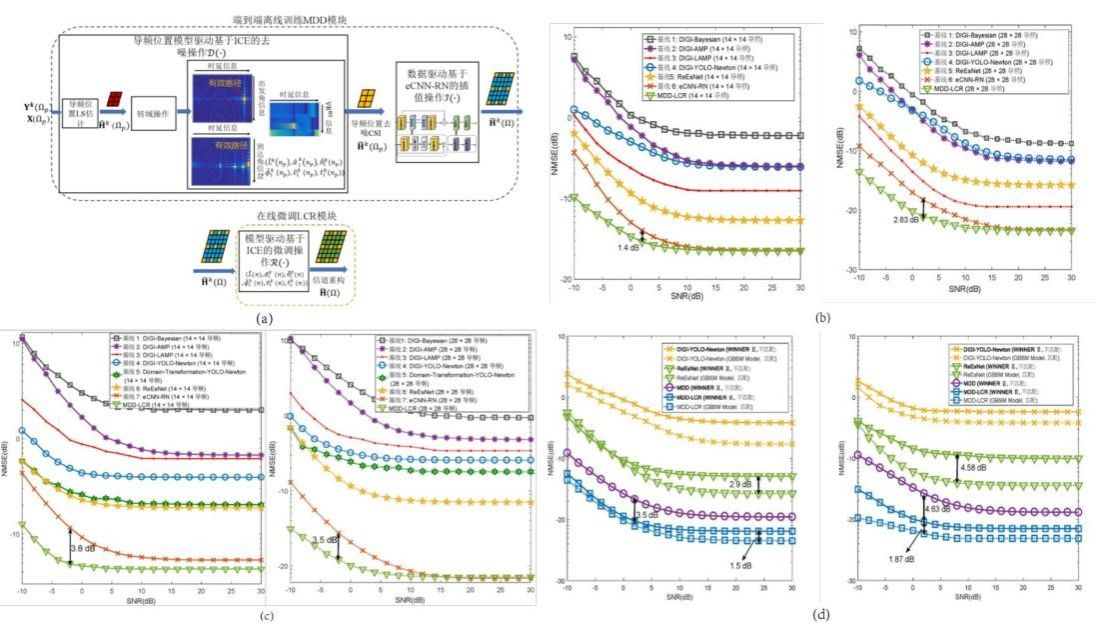 (a)數(shù)據(jù)-模型雙驅(qū)動(dòng)MDD-LCR非平穩(wěn)信道估計(jì)統(tǒng)一框架;(b) 在基站天線數(shù)為16的空域平穩(wěn)環(huán)境下,MDD-LCR方案與傳統(tǒng)基線算法的NMSE與SNR性能對比(14×14和28×28導(dǎo)頻配置);(c) 在基站天線數(shù)為64的空域非平穩(wěn)環(huán)境下,MDD-LCR方案與傳統(tǒng)基線算法的NMSE與SNR性能對比(14×14和28×28導(dǎo)頻配置);(d) 在不匹配的空域平穩(wěn)和非平穩(wěn)場景下,MDD-LCR方案、無LCR模塊的MDD、ReEsNet以及傳統(tǒng)DIGI-YOLO-Newton方法的NMSE與SNR性能對比