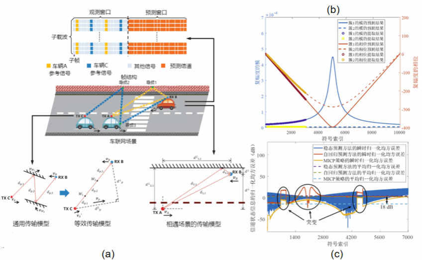 圖1.(a)車聯(lián)網(wǎng)系統(tǒng)模型示意圖, (b)多普勒頻偏和復(fù)幅度的提取和預(yù)測結(jié)果,(c)對向會(huì)車仿真場景中基于不同策略預(yù)測的信道狀態(tài)信息的歸一化均方誤差結(jié)果。