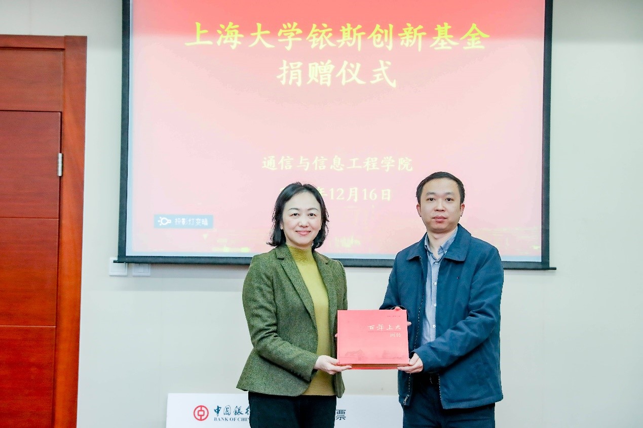 戶外寒風(fēng)料峭,室內(nèi)愛心暖人。大家歡聚一堂,在與會(huì)嘉賓的見證下,歸帆與陳然互贈(zèng)捐贈(zèng)牌和捐贈(zèng)紀(jì)念盤,龔思怡贈(zèng)送給陳成《百年上大》畫冊(cè)一本。此次歸帆向上海大學(xué)教育發(fā)展基金會(huì)捐資100萬元,用于支持上海大學(xué)智慧城市研究院建設(shè)發(fā)展,為我校教育事業(yè)發(fā)展添色增彩。